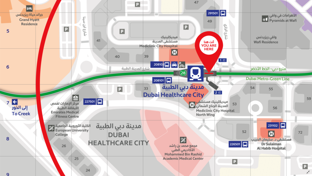 In this Map Gallery Spotlight, we are highlighting another submission from the 2021 Avenza Map Competition. This bilingual map of the area around the Dubai Healthcare City Metro Station was created by Zain Madathil for Explorer Publishing. It is one of nearly 4,000 individual maps he has created for the Dubai Public Transport Map project.